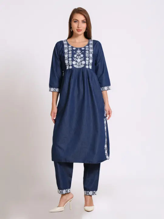Blue Denim Embroidered Kurta Bottom Set