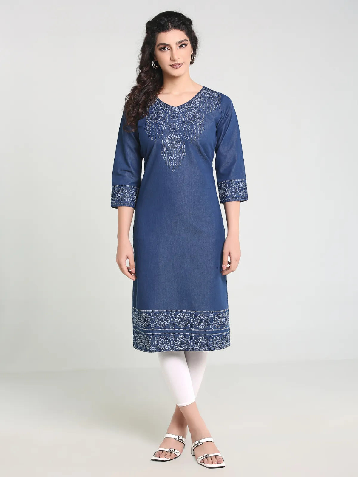 Introducing the Denim Badhni Printed Kurta, crafted with the finest quality denim and adorned with beautiful Badhni prints. This kurta offers a unique blend of comfort and style, making it a must-have for any wardrobe. Elevate your fashion game with this one-of-a-kind piece.